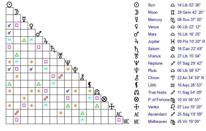 | Sun | 14 Libra 2 | 14 Libra 41 | 5 Sagittarius 4 |