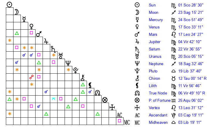| Venus | 17 Scorpio 34 | 14 Libra 27 | 14 Capricorn 48 |