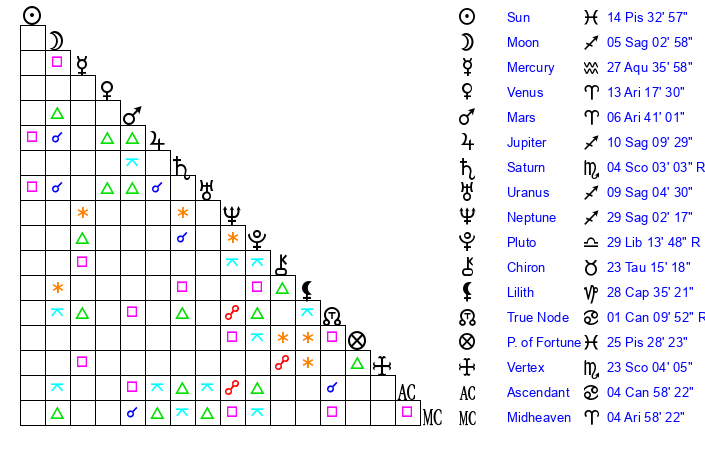 | Saturn | 4 Scorpio 26 | 21 Pisces 11 | 1 Scorpio 54 |