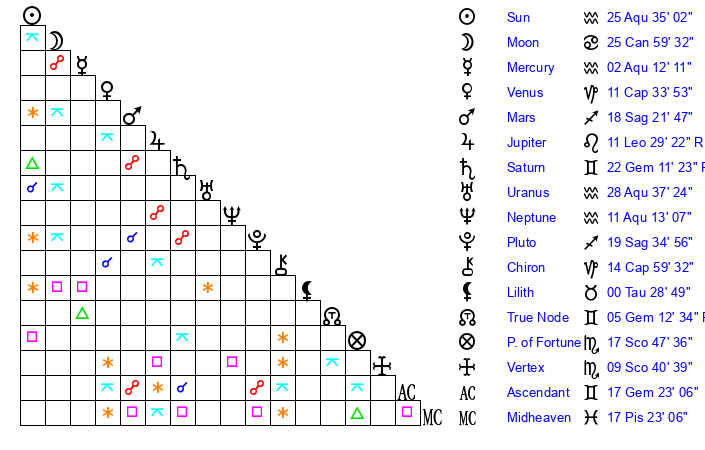 | Sun | 25 Aquarius 35 | 26 Aquarius 15 | 17 Pisces 42 |