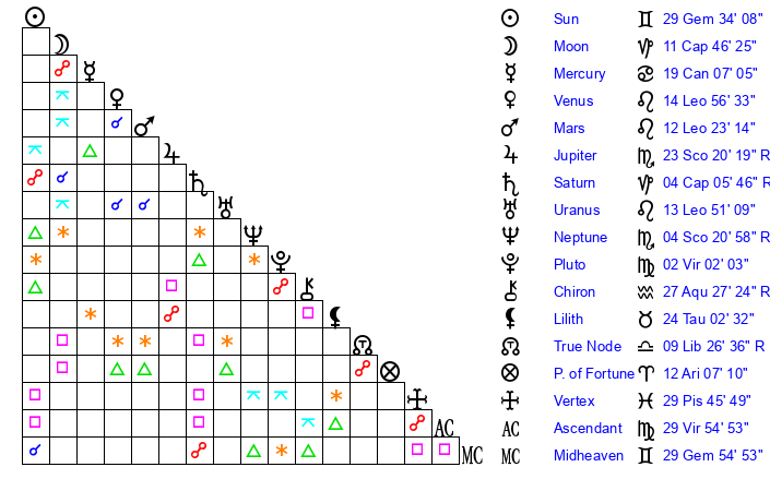 | Sun | 29 Gemini 34 | 0 Cancer 34 | 2 Virgo 42 |