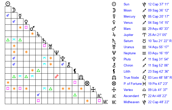 Sun | 12 Capricorn 37 | 13 Capricorn 34 | 8 Aquarius 5 |