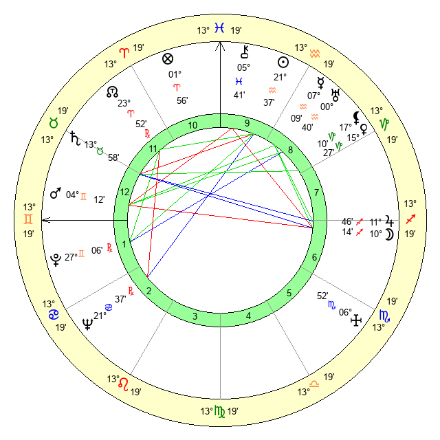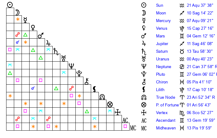 | Sun | 21 Aquarius 37 | 23 Aquarius 13 | 12 Gemini 42 |