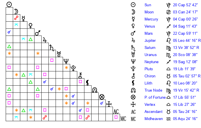 | Sun | 20 Capricorn 53 | 21 Capricorn 44 | 7 Pisces 30 |
