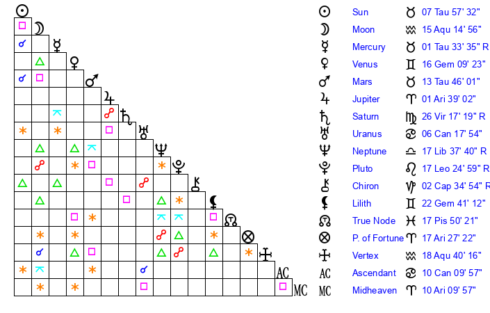 | Moon | 15 Aquarius 15 | 27 Taurus 9 | 17 Libra 20 |
