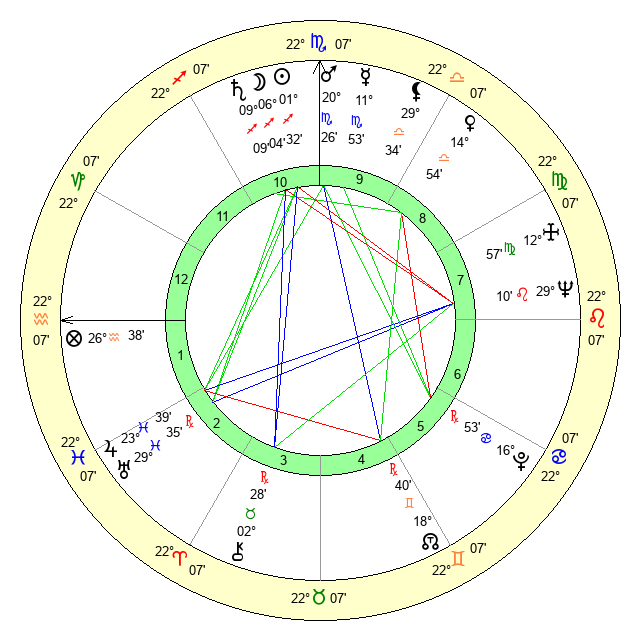| Venus | 14 Libra 54 | 22 Scorpio 27 | 10 Aquarius 0 |
