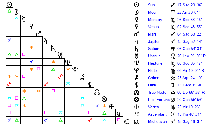 | Sun | 17 Sagittarius 20 | 18 Sagittarius 20 | 24 Aquarius 28 |
