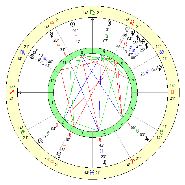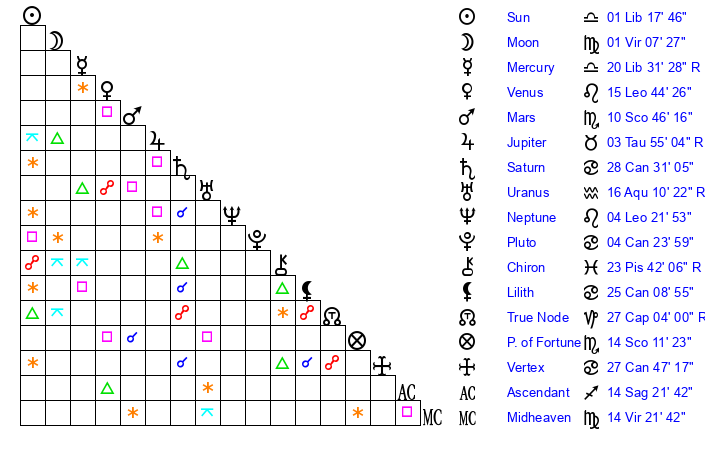 | Moon | 1 Virgo 11 | 3 Scorpio 59 | 27 Leo 29 |