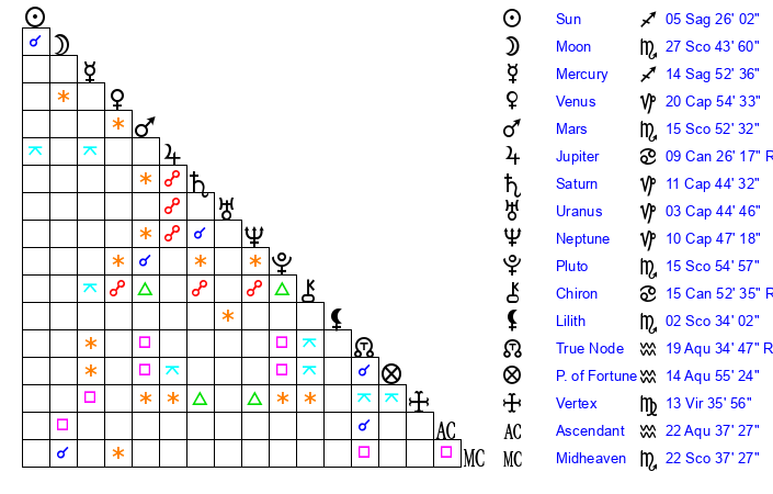 Moon | 27 Scorpio 47 | 26 Libra 22 | 6 Pisces 4 |