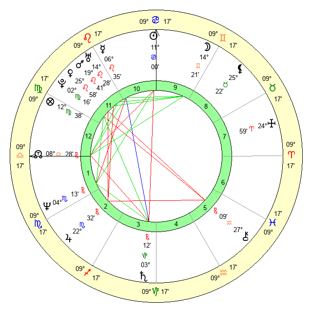 | Moon | 14 Gemini 20 | 21 Libra 52 | 14 Scorpio 51 |