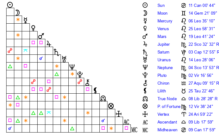 | Moon | 14 Gemini 20 | 21 Libra 52 | 14 Scorpio 51 |