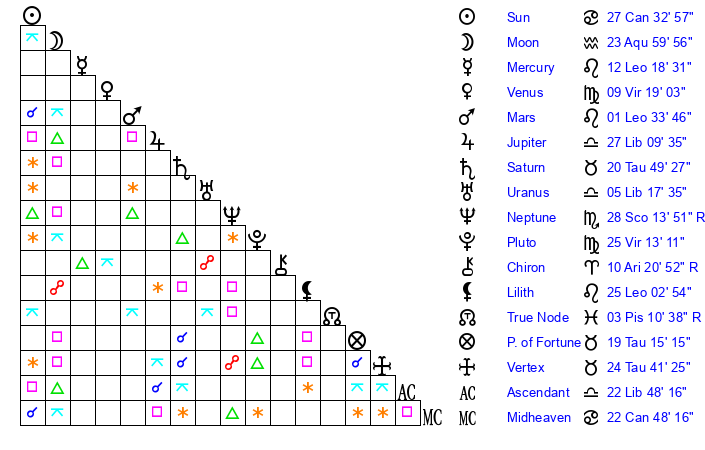 Sun | 27 Cancer 33 | 28 Cancer 14 | 20 Virgo 29 |