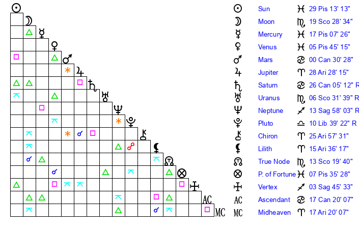 | Sun | 29 Pisces 13 | 29 Pisces 20 | 17 Taurus 14 |