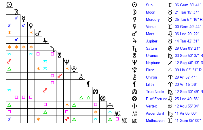 | Mercury | 25 Taurus 57 | 3 Gemini 37 | 23 Cancer 25 |