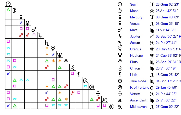Sun | 26 Gemini 2 | 26 Gemini 45 | 24 Cancer 39 |