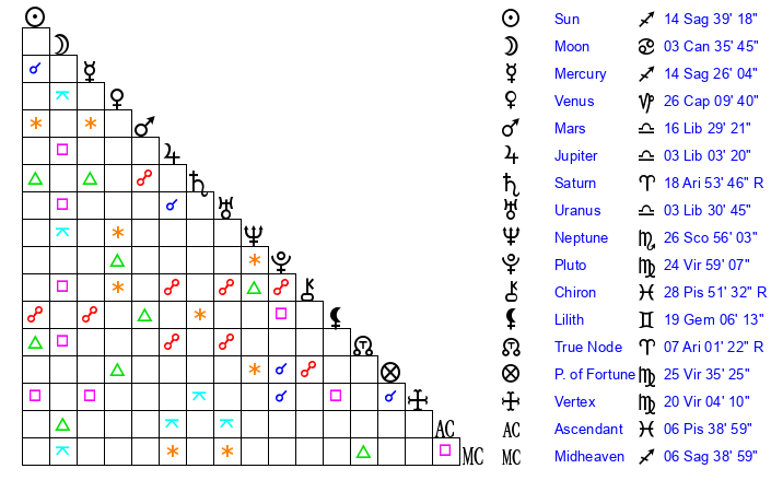 Mercury | 14 Sagittarius 26 | 13 Sagittarius 36 | 6 Aquarius 23 |