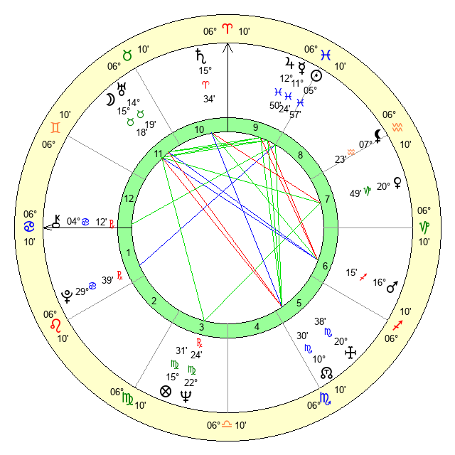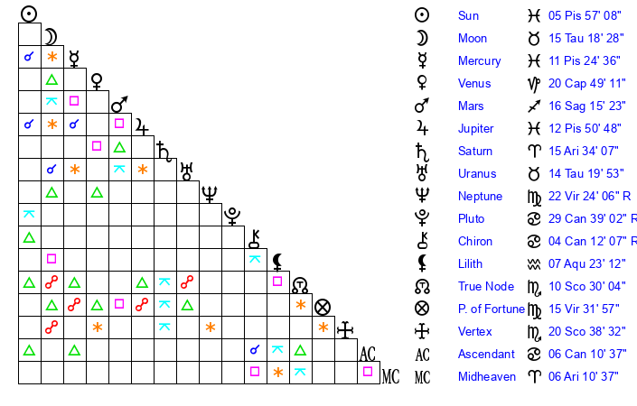 | Sun | 5 Pisces 57 | 7 Pisces 5 | 0 Gemini 27 |