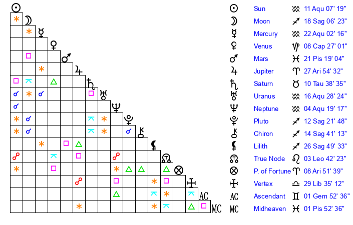 Sun | 11 Aquarius 8 | 12 Aquarius 4 | 6 Pisces 24 |