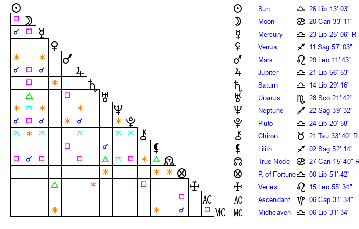 | Saturn | 14 Libra 51 | 26 Pisces 21 | 19 Libra 40 |