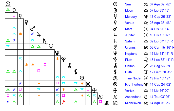 | Sun | 7 Aquarius 33 | 8 Aquarius 36 | 21 Aries 34 |