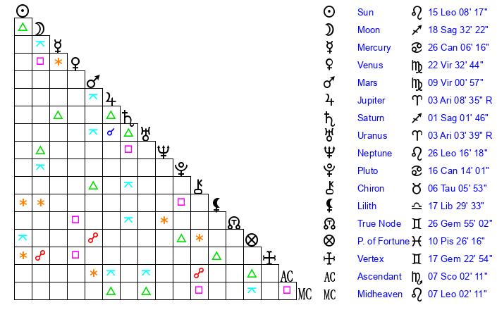 | Moon | 18 Sagittarius 32 | 8 Aquarius 41 | 3 Leo 22 |
