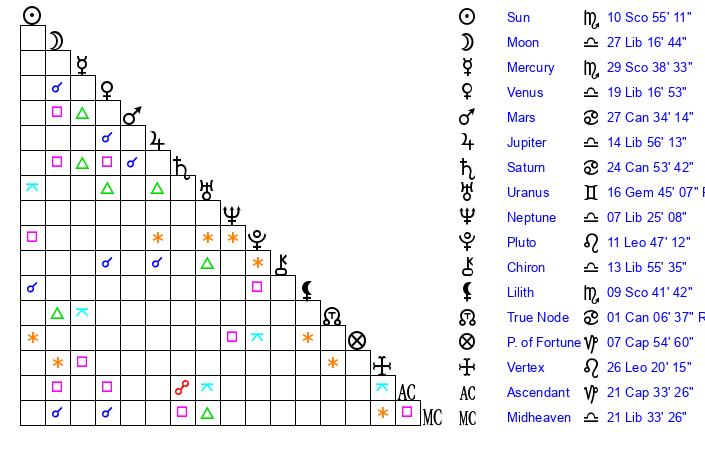 | Moon | 27 Libra 16 | 15 Aries 29 | 4 Libra 25 |