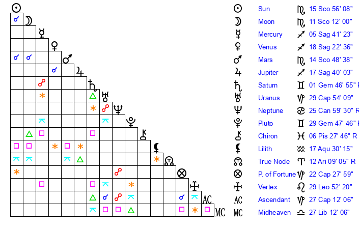 | Sun | 15 Scorpio 56 | 16 Scorpio 32 | 10 Pisces 31 |