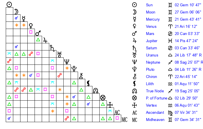 | Moon | 27 Gemini 8 | 14 Aries 51 | 3 Taurus 25 |