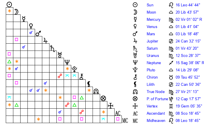 | Sun | 16 Leo 44 | 17 Leo 21 | 2 Libra 16 |