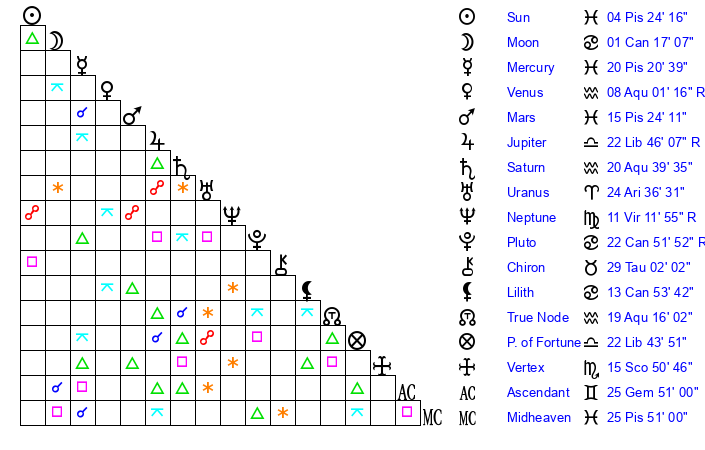 | Sun | 4 Pisces 24 | 5 Pisces 20 | 3 Gemini 46 |