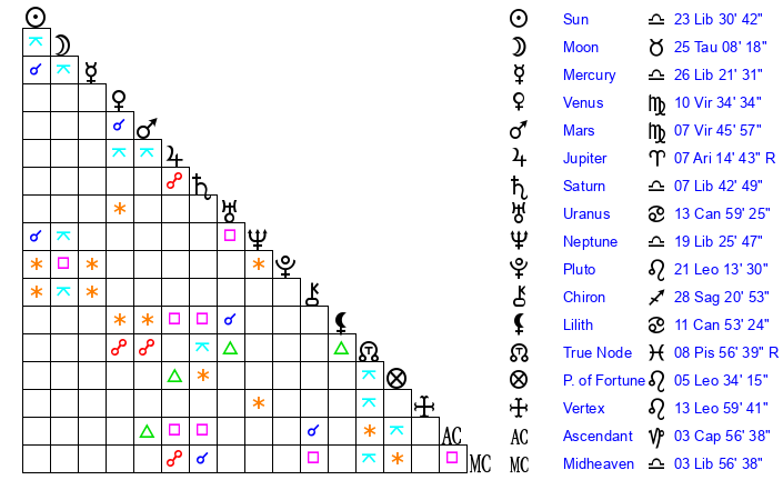 | Saturn | 8 Libra 11 | 26 Pisces 28 | 14 Libra 55 |