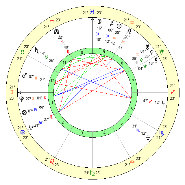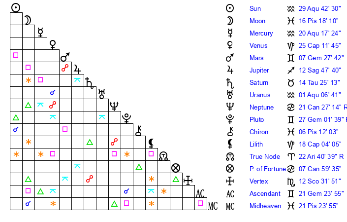 | Sun | 29 Aquarius 42 | 1 Pisces 18 | 20 Gemini 21 |