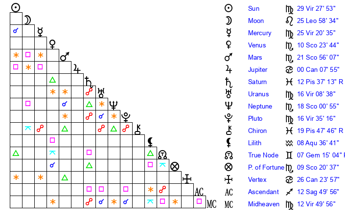 Sun | 29 Virgo 28 | 29 Virgo 56 | 29 Scorpio 11 |