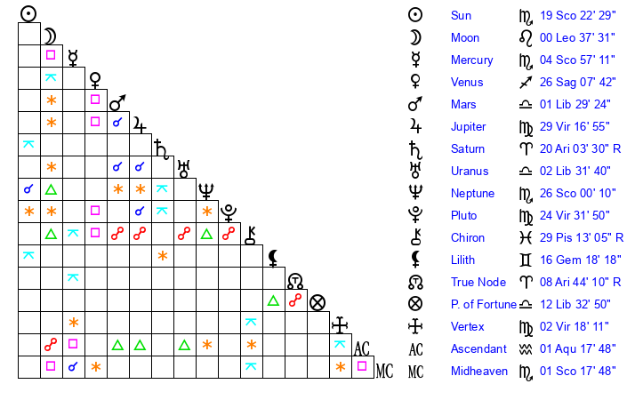 Moon | 0 Leo 36 | 21 Pisces 59 | 18 Leo 52 |
