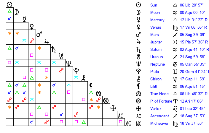 | Sun | 6 Libra 21 | 7 Libra 47 | 9 Aquarius 24 |
