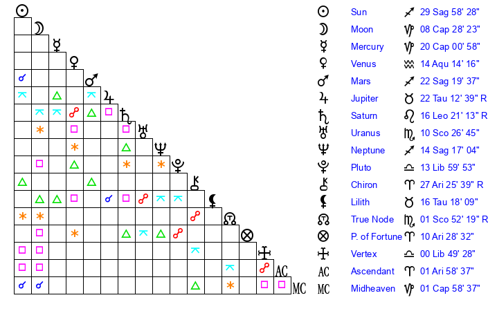 | Sun | 29 Sagittarius 58 | 0 Capricorn 20 | 18 Aquarius 49 |