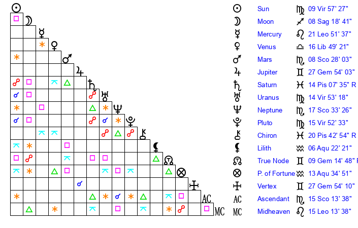 Pluto | 15 Virgo 53 | 1 Aquarius 44 | 17 Virgo 50 |
