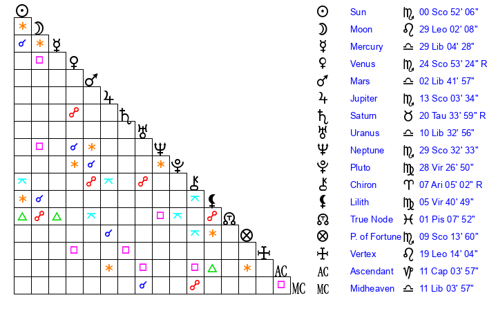Sun | 0 Scorpio 52 | 1 Scorpio 47 | 25 Sagittarius 21 |
