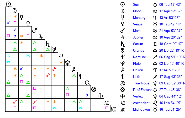 Sun | 6 Taurus 18 | 6 Taurus 43 | 26 Gemini 20 |