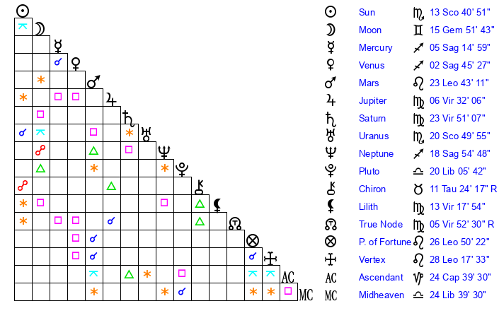 | Sun | 13 Scorpio 41 | 14 Scorpio 47 | 29 Sagittarius 14 |
