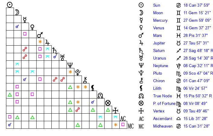 | Venus | 14 Gemini 37 | 6 Gemini 44 | 8 Cancer 24 |