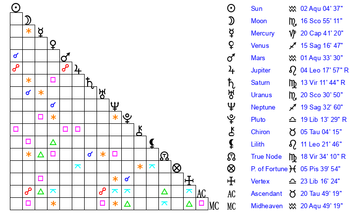 | Sun | 2 Aquarius 5 | 2 Aquarius 56 | 18 Pisces 32 |