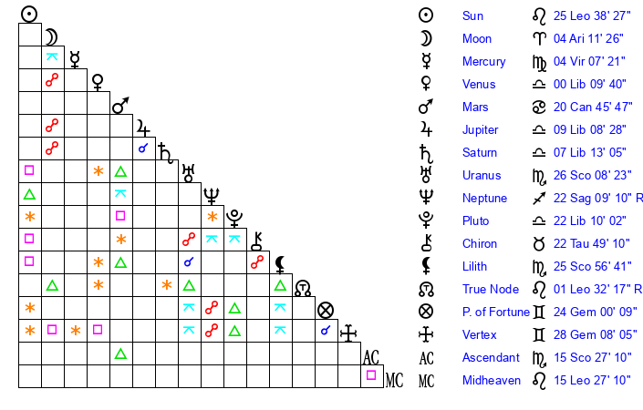 | Sun | 25 Leo 39 | 26 Leo 0 | 8 Libra 25 |