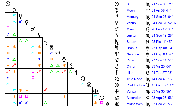 | Pluto | 27 Scorpio 41 | 1 Aquarius 35 | 28 Scorpio 54 |