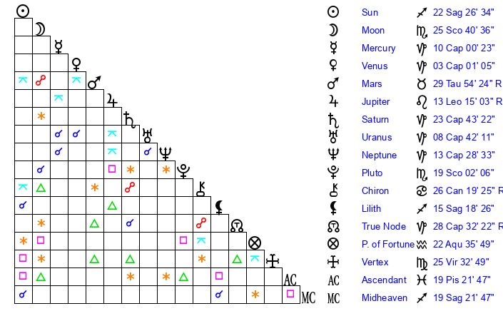 Sun | 22 Sagittarius 26 | 23 Sagittarius 12 | 27 Capricorn 5 |
