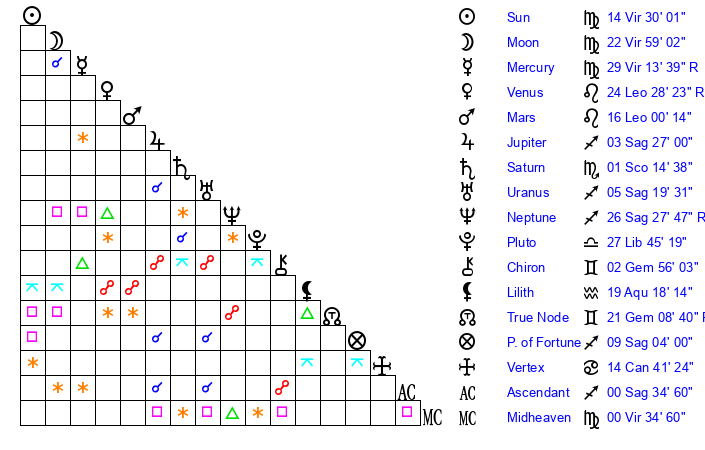 | Sun | 14 Virgo 30 | 15 Virgo 19 | 25 Libra 44 |