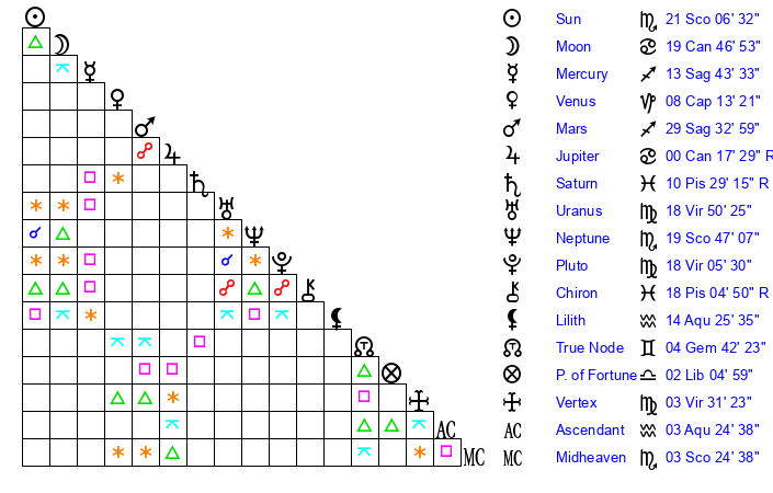 Neptune | 19 Scorpio 47 | 27 Pisces 17 | 21 Scorpio 42 |