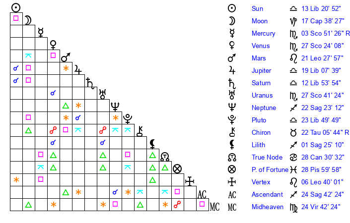 | Moon | 17 Capricorn 39 | 7 Aries 24 | 10 Virgo 15 |