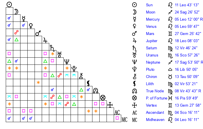 | Sun | 11 Leo 43 | 12 Leo 34 | 26 Virgo 9 |