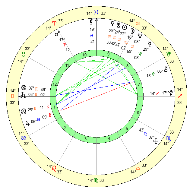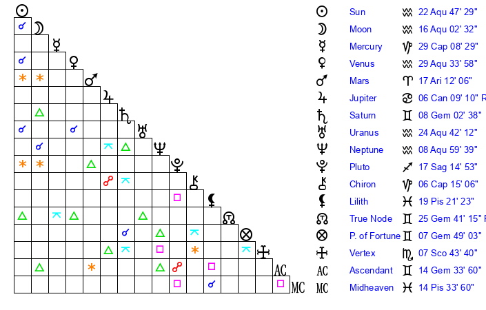 Sun | 22 Aquarius 48 | 23 Aquarius 13 | 15 Pisces 57 |
